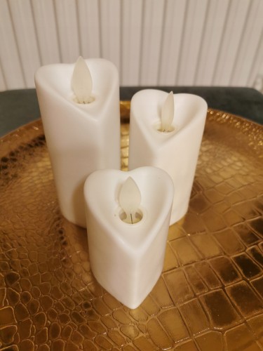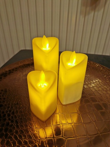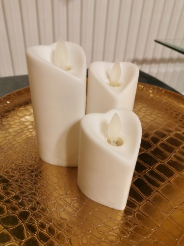 Piękna biała Świeczka LED w formie serca która imituje płomień prawdziwej świecy, bez niebezpieczeństwa stwarzanego przez otwarty ogień i bez plam od topiącego się wosku.