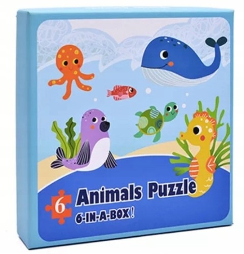6 puzzli przedstawiających zwierzęta wodne, które dzieci z łatwością rozpoznają. Zestaw zawiera 6 puzzli po 6 elementów.