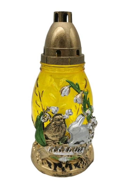 Elegancki, wyjątkowy znicz WIELKANOCNY . Znicz jest wykonany z wysokiej jakości grubego szkła. W zestawie ze zniczem jest wkład parafinowy, tak zwany starter który pali się od 1 do 2 dni.