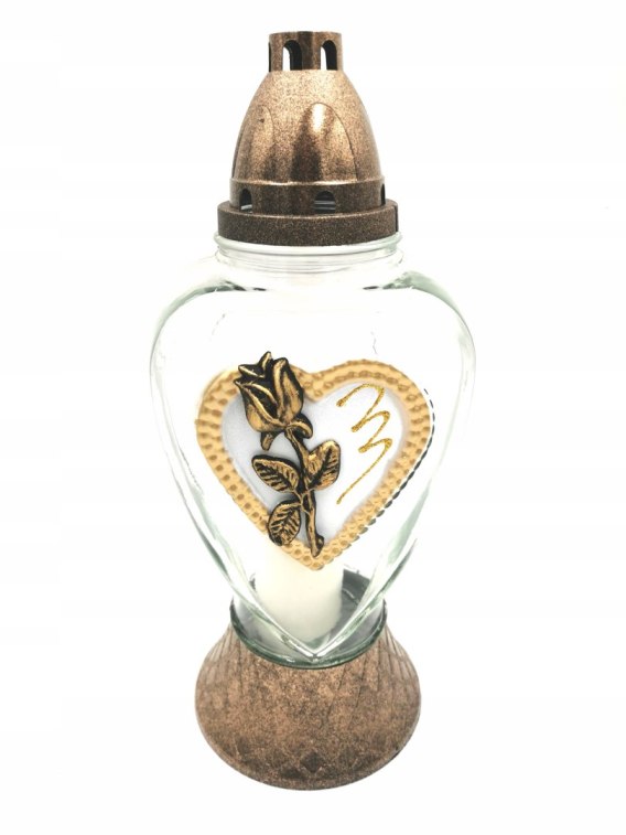 PIĘKNY ARTYSTYCZNY ZNICZ WYKONANY Z MOCNEGO SZKŁA Z NOWOCZESNĄ APLIKACJĄ W KSZTAŁCIE KWIATU I SERCA.