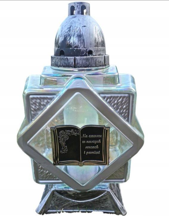 PIĘKNY ARTYSTYCZNY ZNICZ WYKONANY Z MOCNEGO SZKŁA Z NOWOCZESNĄ APLIKACJĄ W KSZTAŁCIE KSIĘGI Z CZYTELNĄ SENTENCJĄ .