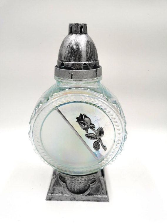Piękny szklany, artystyczny znicz wykonany z mocnego mieniącego się szkła z nowoczesną aplikacją i cudownym niepowtarzalnym wzorem. Znicz posiada dekoracyjną różę która go wyróżnia . Szkło tłoczone.